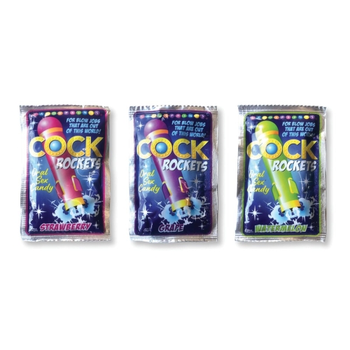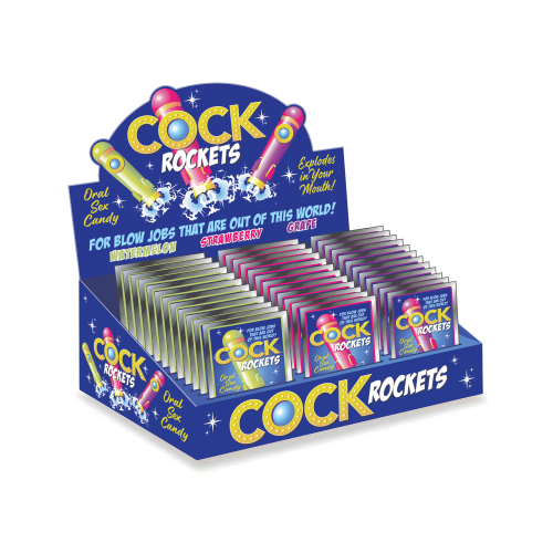 Een explosieve manier om wat pit toe te voegen aan je orale seksrepertoire. Leuk, flirterig en smaakvol: elk zakje zal de zintuigen prikkelen! Cock Rockets orale sekssnoepjes zijn verkrijgbaar in drie spannende smaken: druif, aardbei en watermeloen! Upgrade je pijpbeurt vandaag nog met Cock Rockets orale sekssnoepjes! Elke POP-display bevat 36 zakjes snoep, 12 van elke smaak.