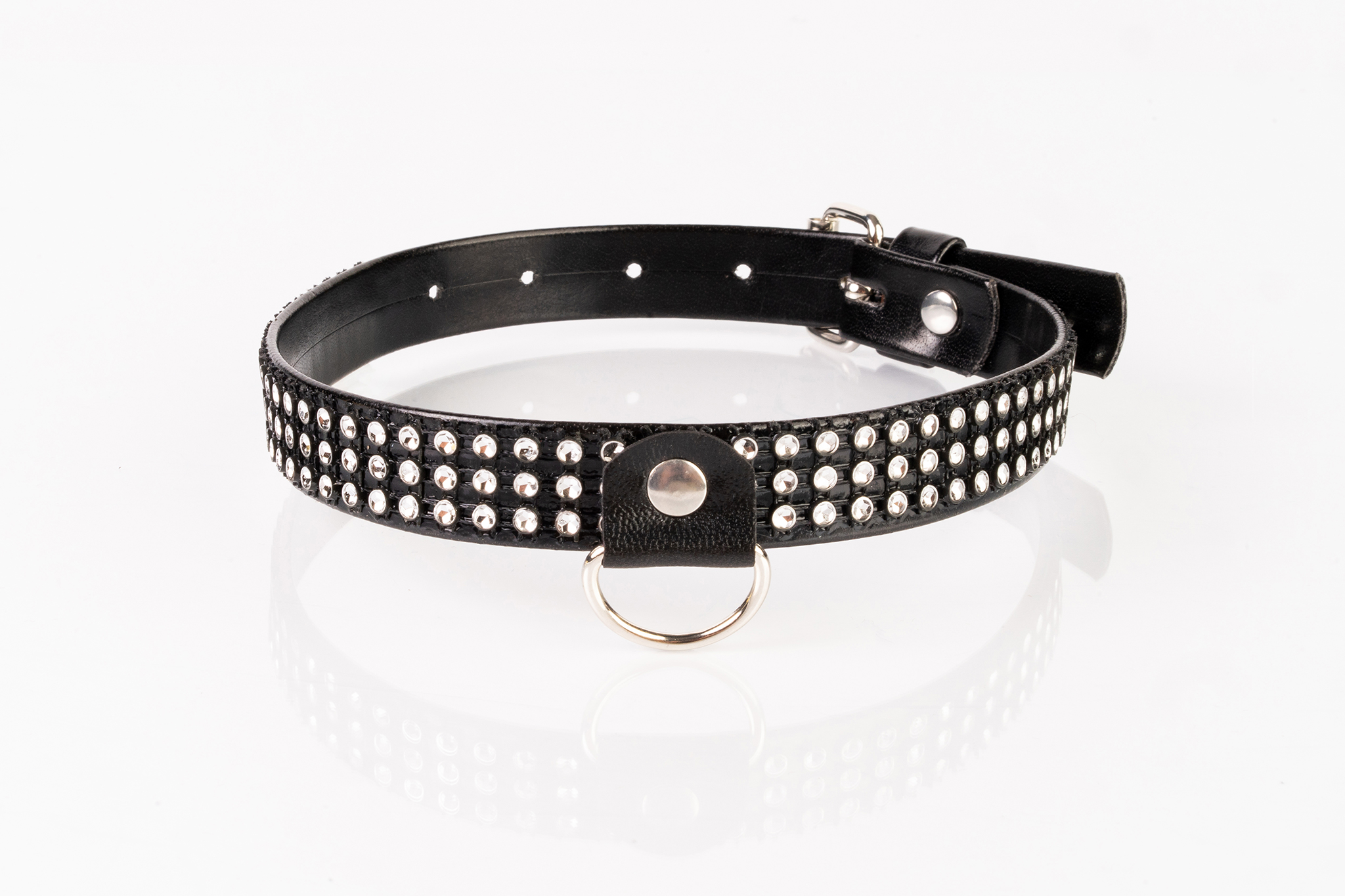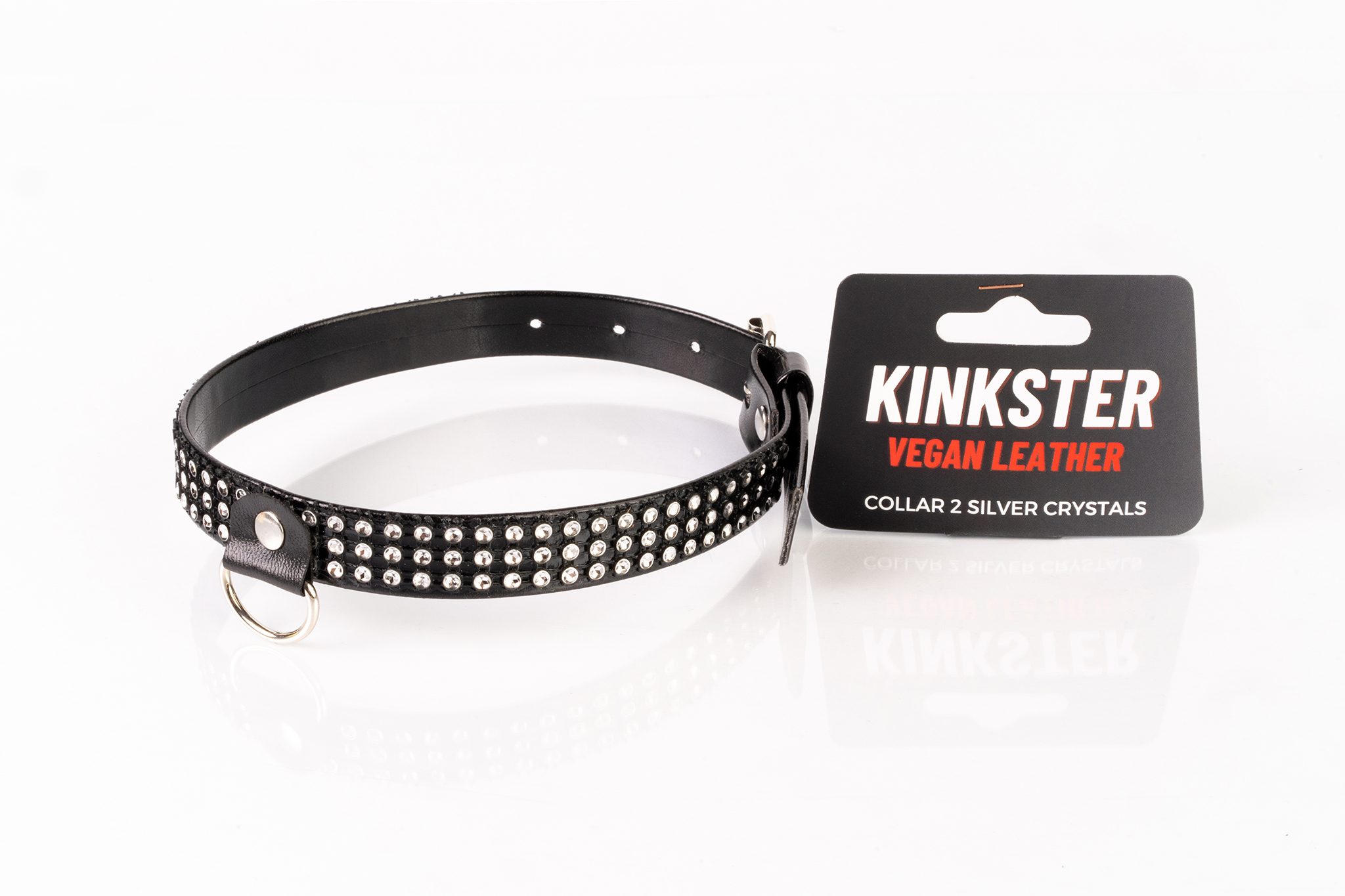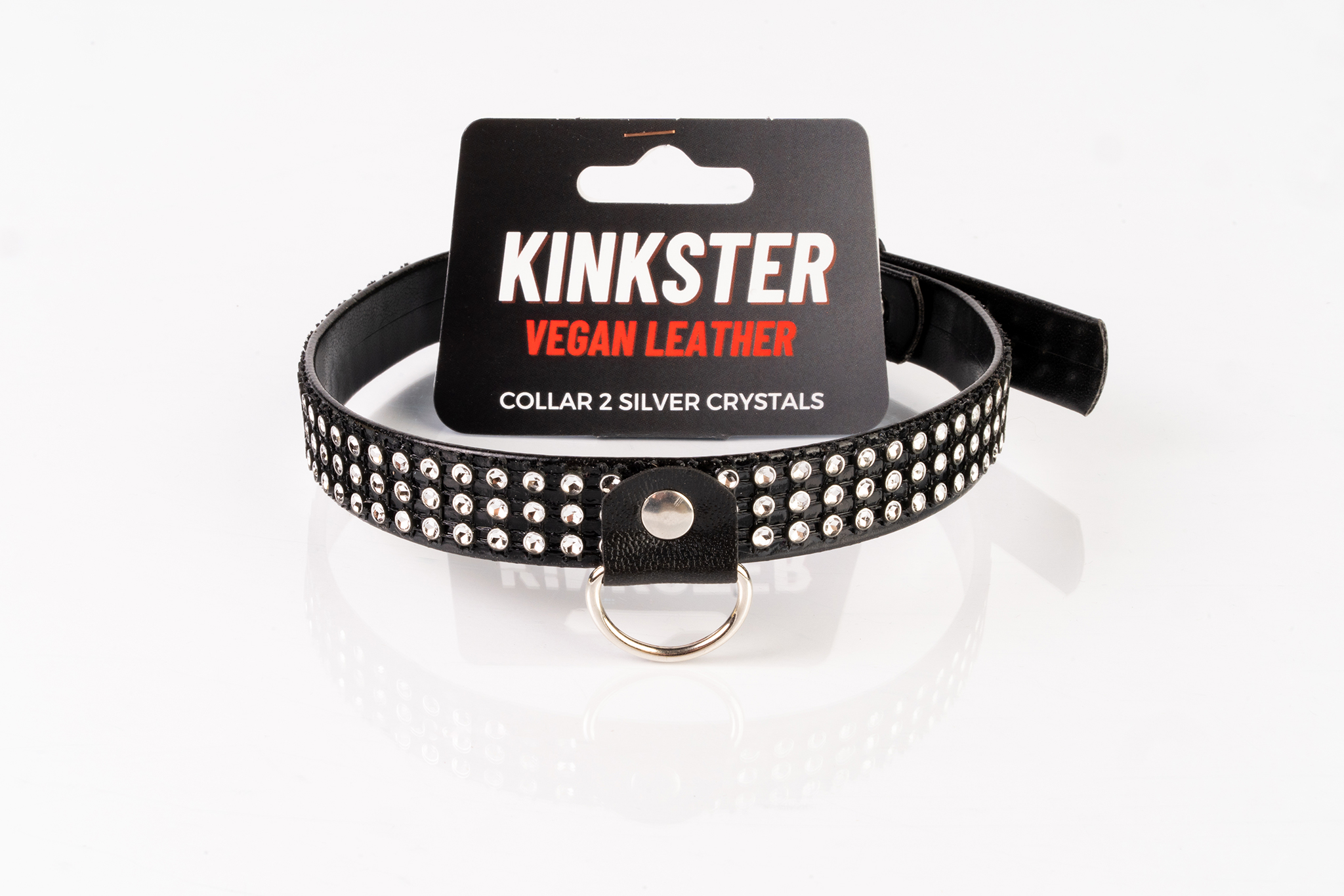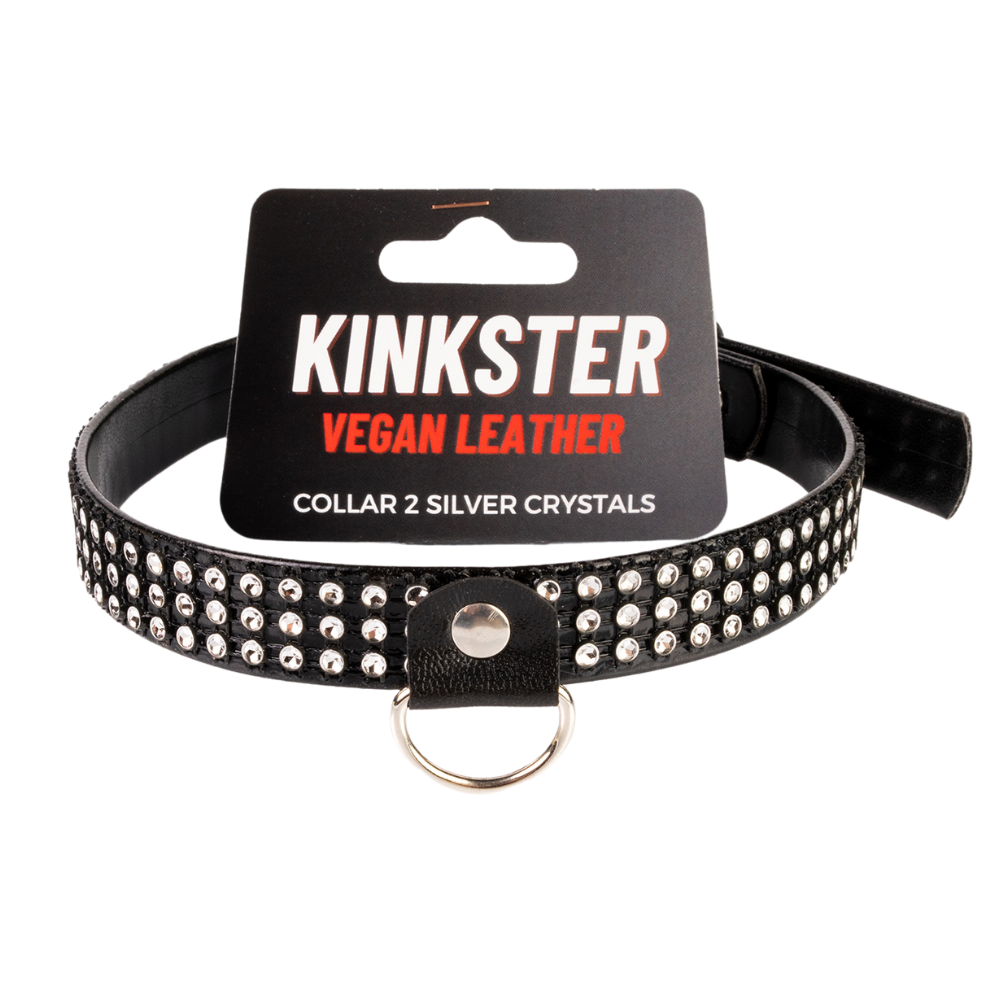 Kinkster – Veganistisch leer – Handgemaakt – Halsband 2 zilveren kristallen