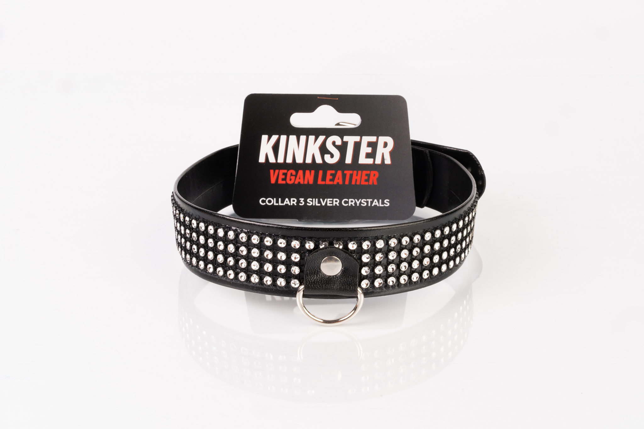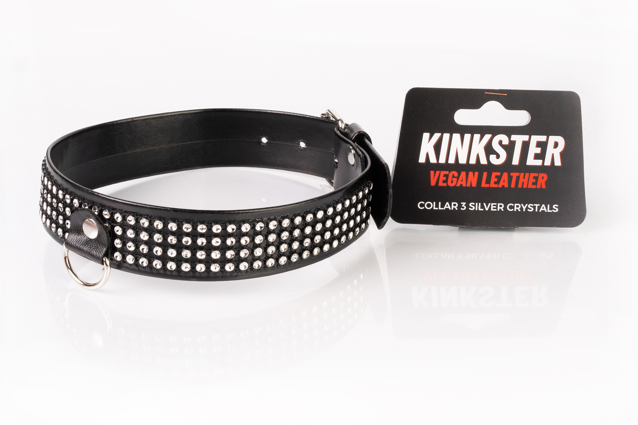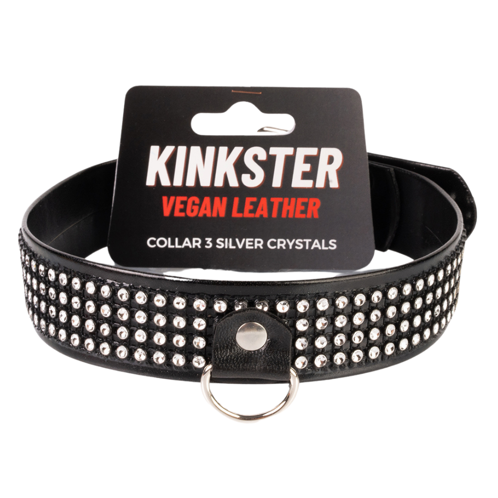 Kinkster – Veganistisch leer – Handgemaakt – Halsband 3 zilveren kristallen