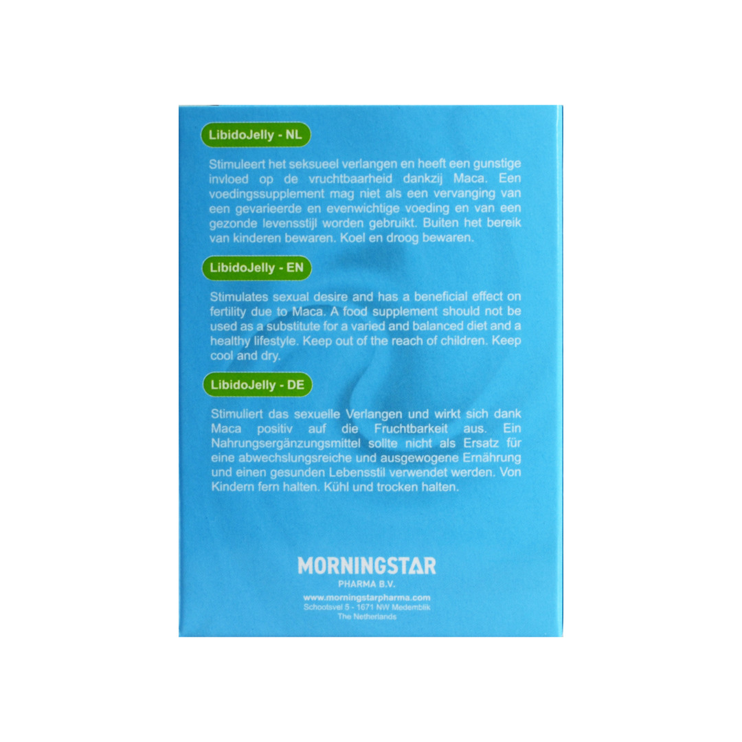 Productomschrijving LibidoJelly is het eerste vloeibare erectiemiddel dat ooit op de markt is gebracht. Het grote voordeel van deze erectievloeistof is dat het snel door het lichaam wordt opgenomen, waardoor het ook snel zijn werk kan doen. Binnen enkele minuten is het effect merkbaar als een aangename tinteling van een opkomende erectie, zonder negatieve bijwerkingen! Ingrediënten per sachet van 10 ml: Ginkgo Biloba (10 mg), Muira Puama (10 mg), Macawortel (10 mg). Hulpstoffen: Citroensmaak, E202, E211, E330, E415, E955, E967, Water ter verduidelijking. Gebruiksaanwijzing: Neem 1 sachet vóór de seksuele activiteit. Niet meer dan 2 sachets per dag innemen.