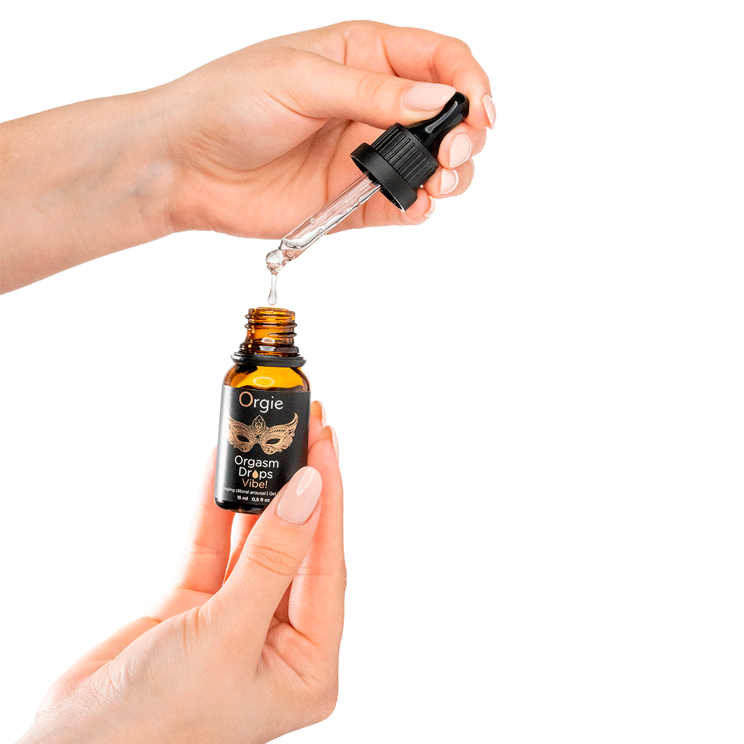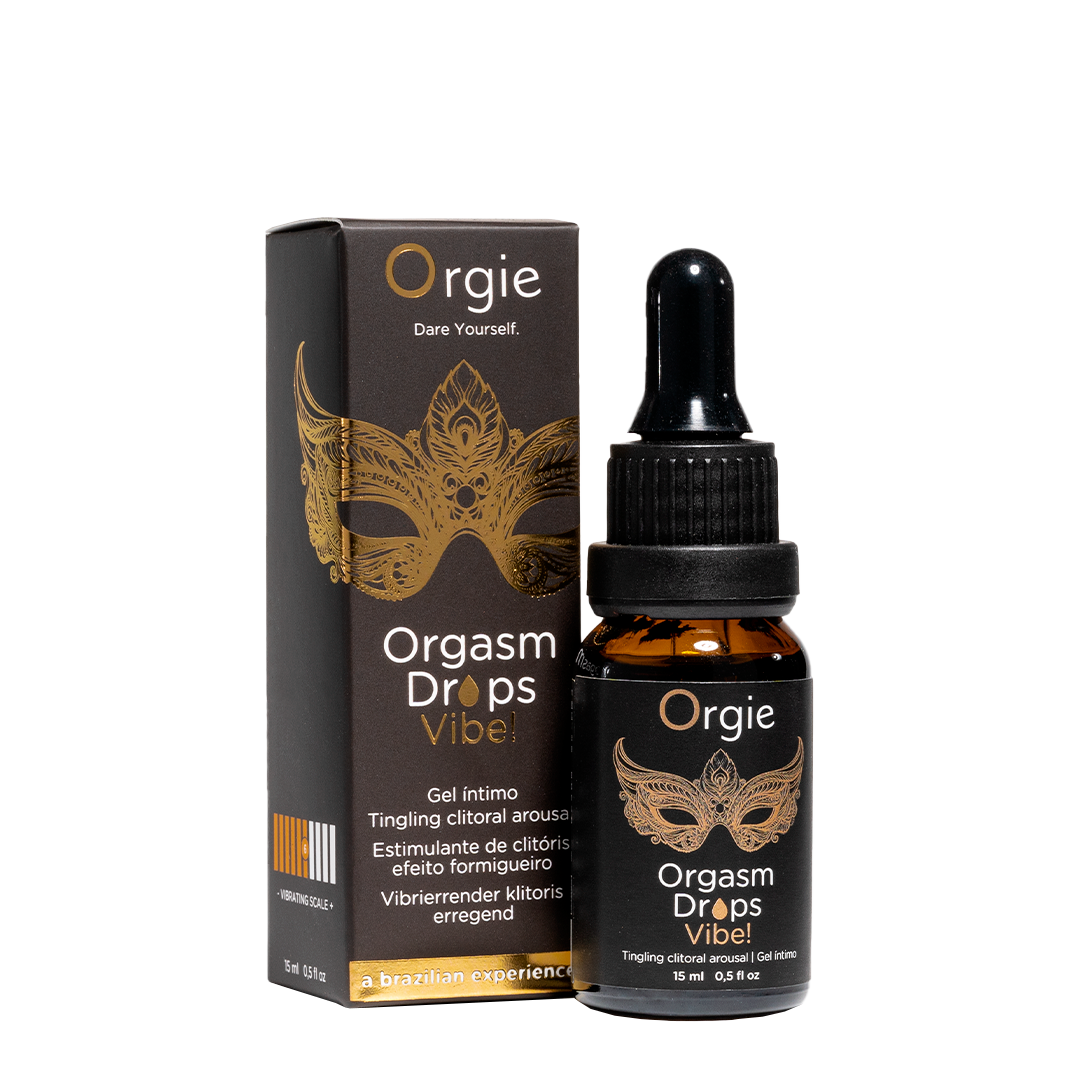Orgasm Drops Vibe! heeft dezelfde effecten als Orgasm Drops-producten. Het is kusbaar, sensibiliseert de clitoris en zorgt voor een verfrissende sensatie, gevolgd door een aangenaam verwarmend gevoel, wat leidt tot een wervelwind van genot, nu versterkt door het nieuwe effect: de al bekende, direct trillende sensatie van Orgie’s productlijn Sexy Vibe!